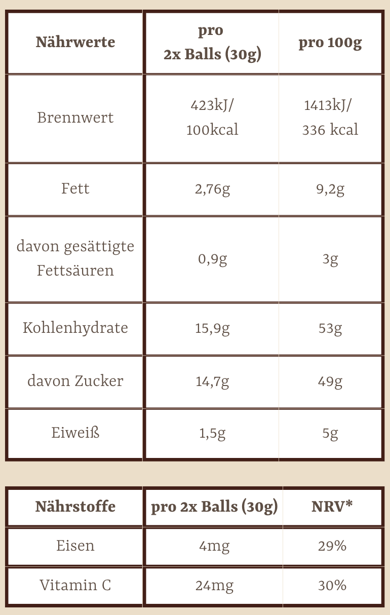 Unsere Energy Balls bestehen aus natürlichen Zutaten wie Datteln, Mandeln und gefriergetrockneten Früchten. Der zusätzliche Eisenboost entsteht durch das Eisenbisgylcinat - und das Vitamin C vom Acerolapulver.